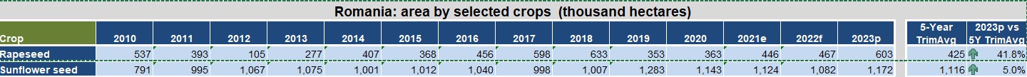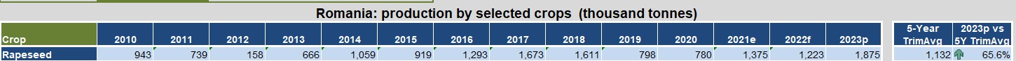 O cultură nu foarte populară în rândul fermierilor români în urmă cu 10 ani, rapița devine de interes pe fondul schimbărilor macroeconomice din ultima vreme. Suprafața cultivată este pe un trend ascendent, de la 460.000 ha în 2022 la 603.000 ha cât se estimează pentru 2023, iar pentru anul comercial 2023/2024 estimările indică o producție record.