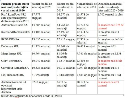 În top zece a intrat Lidl, pe poziţia a noua, ca urmare a creşterii numărului mediu de angajaţi cu 1.361 oameni în anul crizei Covid-19. Din top zece a ieşit însă producătorul de sisteme de siguranţă auto Autoliv Romania SRL, în urma scăderii numărului mediu de angajaţi cu peste 670 de oameni în 2020 faţă de nivelul din 2019, arată analizele făcute de Economica.net anual despre subiect.