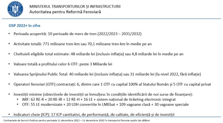 Luni, 7 noiembrie 2022, a avut loc la sediul Ministerului Transporturilor și Infrastructurii (MTI) o conferință de presă ocazionată de prezentarea Contractelor de Servicii Publice (CSP) pentru perioada 2022 – 2032 în transportul feroviar public de călători. Acestea urmează să fie adoptate prin hotărâre de guvern și încheiate de ARF cu cei șase operatori de pe piața din România.