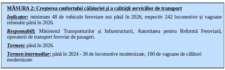 „Pentru a atrage cât mai mulți călători care să utilizeze serviciile de transport feroviar de călători este nevoie de asemenea de reînnoirea parcului de vehicule feroviare (locomotive, vagoane, rame electrice)”, spun autorii documentului.
