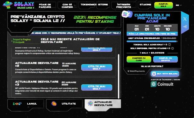 Un element cheie care atrage investitorii este mecanismul de staking al Solaxy, care oferă un randament de 223% la momentul scrierii acestui text. Proiectul a alocat 25% din totalul oferte de $SOLX pentru recompense de staking. Astfel, încurajează participarea pe termen lung a investitorilor. Acest lucru oferă deținătorilor posibilitatea de a câștiga randamente semnificative într-un mod pasiv.
