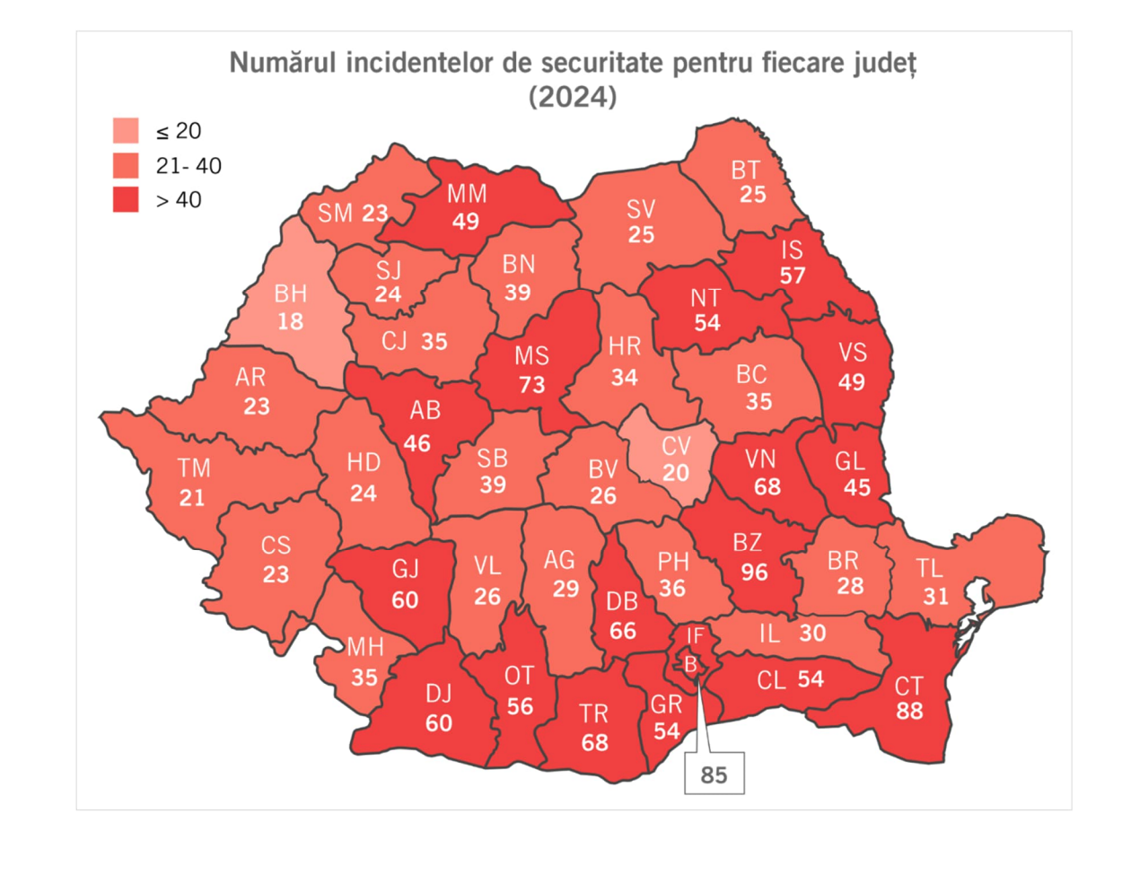 La polul opus din punct de vedere al numărului de incidente/județ, în 2024 un singur județ a avut mai puțin de 20 de incidente, respectiv judeţul Bihor.