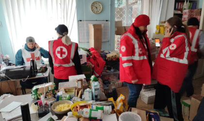 Echipele Crucii Roşii sunt formate din trei vehicule cu nouă membri şi intenţionează să conducă în afara oraşului un convoi de 54 de autobuze ucrainene şi un număr neprecizat de automobile private.