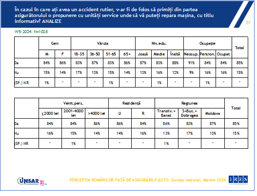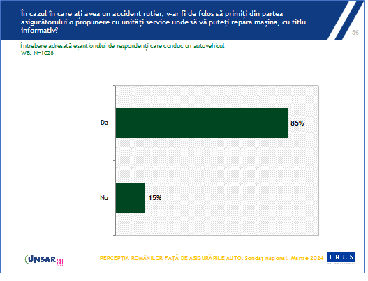 Astfel, întrebați dacă le-ar fi de folos, în cazul în care ar avea un accident rutier, să primească din partea asigurătorului o propunere, cu titlu informativ, cu unități service unde să își poată repara mașina, 85% dintre respondenți au răspuns afirmativ. Cercetarea sociologică a fost realizată de IRES, la solicitarea UNSAR, în primul trimestru al acestui an, pe un eșantion reprezentativ de 1.028 de respondenți, cu vârste de peste 18 ani, care conduc un autovehicul.