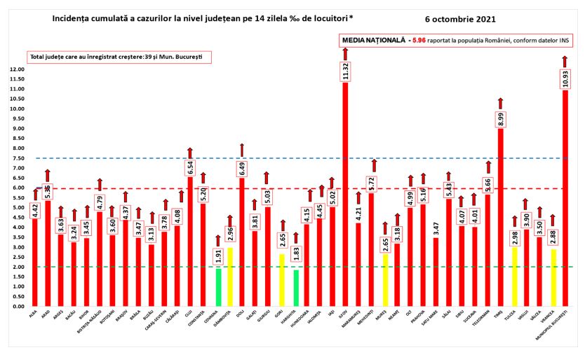 Media naţională a ratei de infectare este de 5,96 la mia de locuitori.