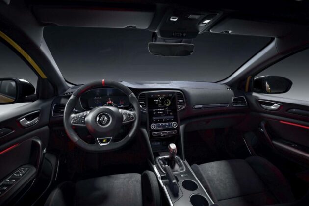Dotările standard din interior includ scaune Recaro cu tapițerie Alcantara negru titan și monograma RS brodată. Cardul-cheie hands-free a lui Megane RS Ultime reflectă pattern-ul diamantat de pe caroserie. Pragurile ușilor sunt exclusive, iar fiecare model are propria sa placă metalică numerotată lângă comenzile transmisiei, în partea de jos a consolei. Este semnată de Laurent Hurgon, pilotul și expertul în dezvoltare care a lucrat la Megane RS de-a lungul carierei sale și deține în prezent recordurile de pe Nürburgring, Suzuka și Spa-Francorchamps.
