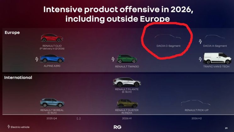 Informațiile comunicate de oficialii grupului Renault cu ocazia prezentării rezultatelor financiare pentru 2025 arată, printre altele, că, în 2026, „pentru a își reînnoi și extinde gama pe piața europeană, în special în segmentul vehiculelor electrice și hibride”, grupul Renault va lansa mai multe noi produse printre care „un nou model electric Dacia de segment A, un nou model Dacia termic și hibrid de segment C”.