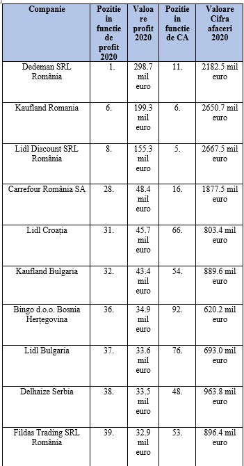 Topul retailerilor în funcție de valoarea profitului net din 2020, în clasamentul celor 100 de companii din Europa de Sud-Est realizat de către publicația SEE News.