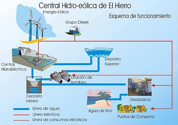 Când bate vântul, se produce mai multă energie decât s-ar consuma în mod normal şi atunci excesul este folosit pentru pomparea apei dintr-un mare rezervor natural într-altul, situat la o înălţime mai mare. Apa este luată mai întâi din mare şi desalinizată.