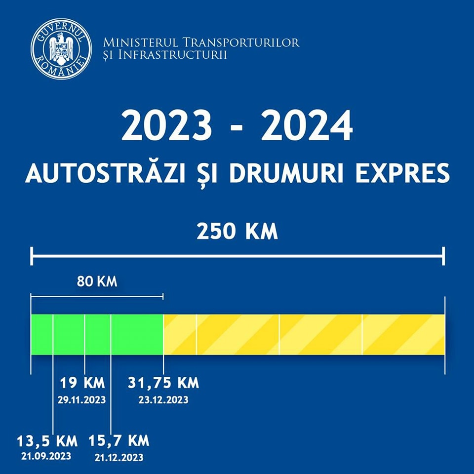 Prin urmare, pentru a fi atinsă această țintă, anul viitor ar trebui să fie deschisă circulația pe încă 169 de kilometri. Rămâne de văzut dacă în 2024 vom înregistra cei mai mulți kilometri noi de autostradă și drum expres din România.