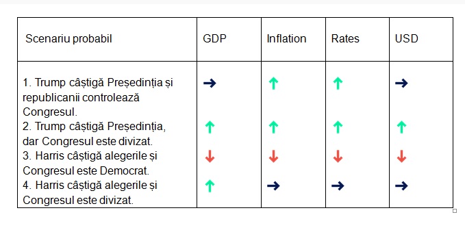 3. Harris câștigă alegerile și Congresul este Democrat. În acest scenariu, va exista o creștere a taxelor și simultan o creștere a cheltuielilor guvernamentale, cu un impact ușor negativ asupra creșterii economiei SUA în 2025 și o ușoară creștere a șomajului. În plus, inflația de consum ar continua să scadă la 2%, permițând Rezervei Federale spațiu pentru a reduce ratele dobânzilor mai rapid, ceea ce ar slăbi dolarul.