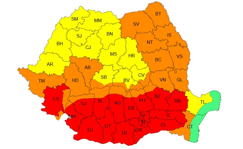 Valul de căldură se va extinde și va continua să se intensifice, iar în județele Caraș-Severin, Mehedinți, Gorj, Dolj, Olt, Vâlcea, Argeș, Teleorman, Giurgiu, Dâmbovița, Prahova, Buzău, Brăila, Ialomița, Călărași, Ilfov și municipiul București se vor înregistra temperaturi maxime de 38…41 de grade.