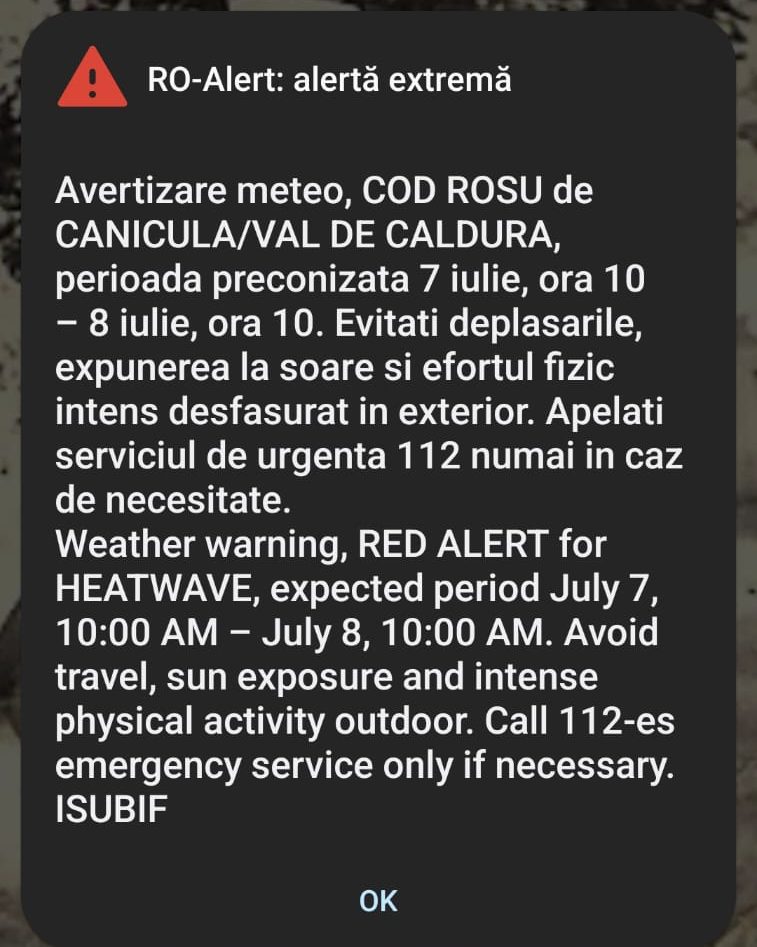 ”Avertizare meteo/Cod roşu de caniculă/val de căldură – perioada preconizată 7 iulie, ora 10:00 – 8 iulie, ora 10:00. Evitaţi deplasările, expunerea la soare şi efortul fizic intens desfăşurat în exterior” – a fost mesajul transmis prin RO-ALERT.