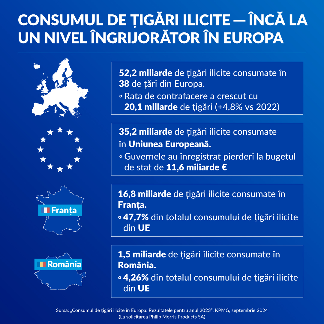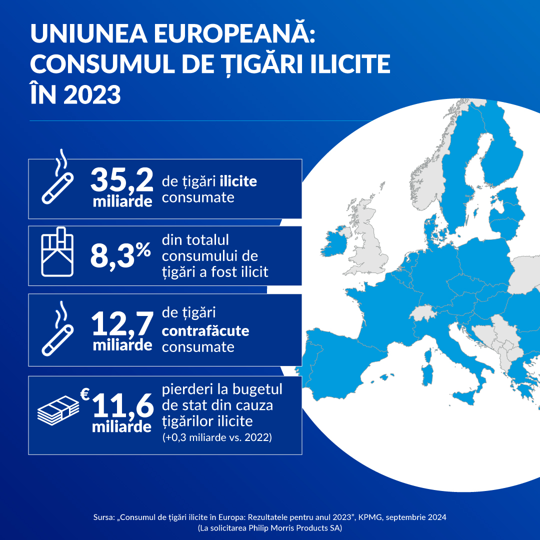 Rezultatele studiului anual KPMG din 2023 privind consumul ilicit de țigări, realizat la cererea Philip Morris International, relevă faptul că piața ilicită din UE continuă să fie o amenințare majoră pentru sănătatea și securitatea publică, precum și pentru economiile statelor. Țigările contrafăcute rămân una dintre principalele surse de consum ilicit din regiune, cu 12,7 miliarde (36%) de țigări consumate – pe măsură ce rețelele infracționale vizează din ce în ce mai mult piețele cu taxe mai mari și cu prețuri mai mari. În ansamblu, guvernele din UE au pierdut venituri fiscale estimate la 11,6 miliarde EUR, în creștere față de 11,3 miliarde EUR în 2022. Franța conduce, în continuare, în clasamentul țărilor cu cel mai mare consum ilicit din Europa, cu 16,8 miliarde de țigări ilicite și 7,3 miliarde EUR venituri fiscale pierdute.