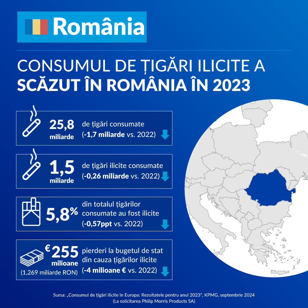 În România, conform datelor publicate în studiul KPMG, consumul ilicit de țigări a atins un nivel minim istoric. Astfel, în România, consumul ilicit de țigări a scăzut în 2023 și a atins o medie anuală de 5,8%.