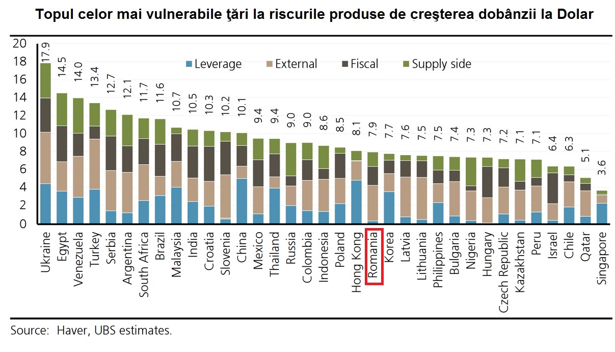 România a fost plasată abia pe locul 21 într-un top al riscurilor induse de decizia FED, care include cele mai importante 35 de ţări emergente din lume, în percepţia UBS.