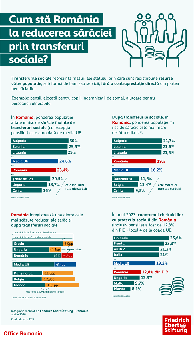 Datele analizate arată că România înregistrează una dintre cele mai scăzute reduceri ale sărăciei în puncte procentuale, după transferuri sociale (4,4 pp), alături de Ungaria (4,4 pp) şi Grecia (3,9 pp).
