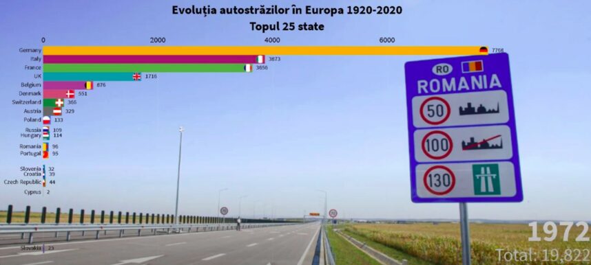 Deși acum se află pe poziția a patra în topul european, cu o rețea de aproape 7.000 de kilometri de autostradă, Italia se afla pe primul loc în prima decadă din perioada 1920 – 2020, luată în calcul la realizarea infograficului. Descendenții constructorilor faimoaselor drumuri romane dominau inițial topul țărilor europene cu o rețea de doar 58 de kilometri. Ulterior, în perioada interbelică, în timp ce Italia rămâne la acest nivel, Germania începe să construiască rapid autostrăzi, depășind mia de kilometri în doar câțiva ani.