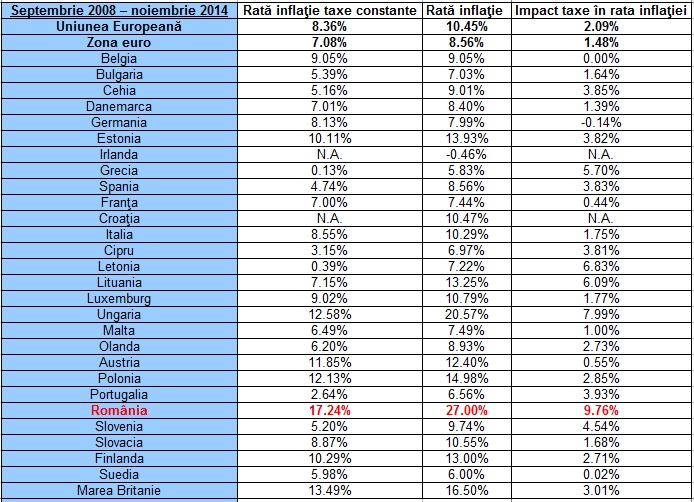 Datele arată că creşterile de taxe sunt responsabile pentru circa 10 puncte procentuale din creşterea ratei inflaţiei începând cu septembrie 2008, arată calculele ECONOMICA.NET pe baza datelor Eurostat privind evoluţia inflaţiei la un nivel de taxare constantă. Chiar şi fără ajutorul statului strângăreţ, România întregistrează cel mai mare nivel al ratei inflaţiei începând cu trimestrul trei din 2008, de 17,2%, de peste două ori mai mare decât media din UE de 8,36% sau cea din zona euro de 7%. Singurii care se apropie de noi sunt britanicii, cu o rată de 13,5%, polonezii, finlandezii şi ungurii, cu o rată de 11-12%.