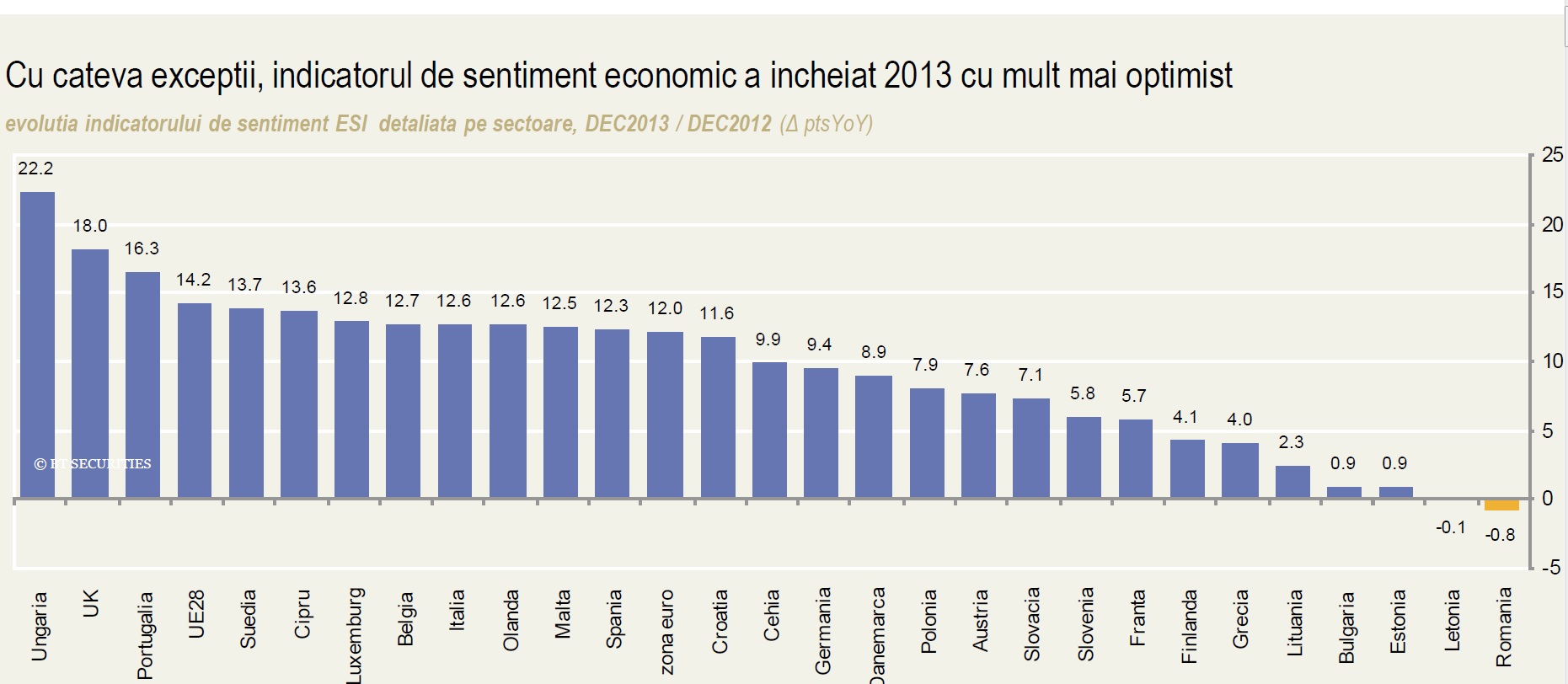 ESI a fost de de -0,1 în Letonia şi de -0,8 în România. Printre cele mai pesimiste ţări se mai numără Estonia şi Bulgaria (scor ESI 0,9), Lituania (2,3), Grecia (4), Finlanda (4,1) şi Franţa (5,7).