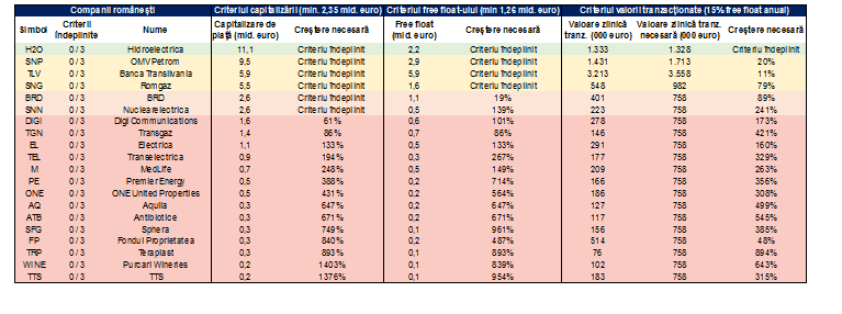 La jumătatea anului 2025, România are o singură companie, Hidroelectrica, ce îndeplinește toate cele trei criterii MSCI. Alte trei companii: OMV Petrom, Banca Transilvania și Romgaz, îndeplinesc în prezent două din cele trei criterii. Decalajele cu care se confruntă acestea, în special în ceea ce privește lichiditatea, sunt semnificative, dar pot fi recuperate. Banca Transilvania ar avea nevoie de o creștere de 11% a valorii tranzacționate, iar OMV Petrom de o creștere de 20% pentru a atinge pragul ATVR. Aceste obiective ar putea fi atinse dacă ritmul actual al activității de pe piață, determinat de optimismul reînnoit al investitorilor, se va menține în lunile următoare.