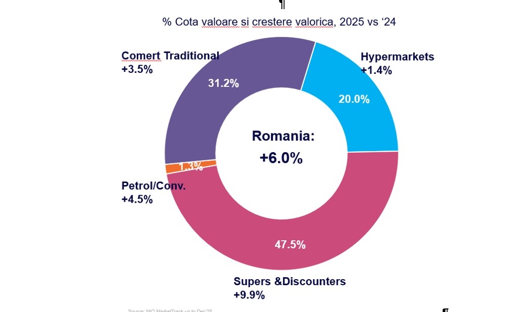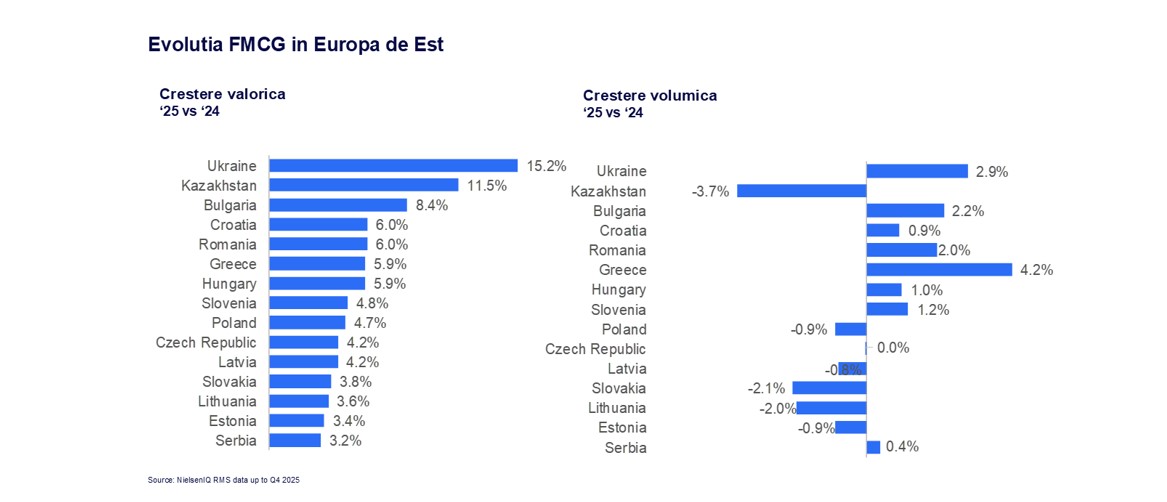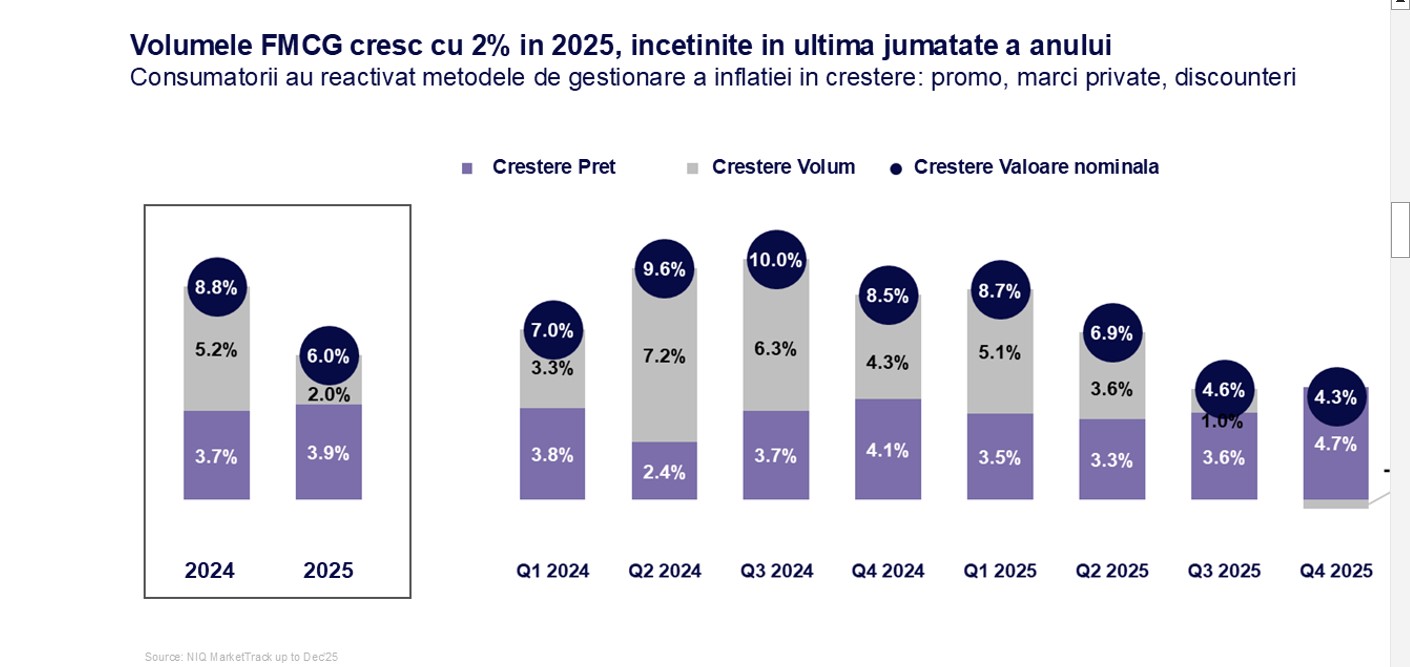 „Sectorul FMCG a început în forță anul 2025, dar am înregistrat semnele de presiune asupra consumatorilor din a două jumătate a anului”, spune Iulia Pencea, director general NIQ România. „Volumele au devenit ușor negative (-0.4%) în trimestrul 4 din 2025, deoarece costurile mai mari ale energiei, stagnarea salariilor și creșterile de TVA au redus puterea de cumpărare a românilor.”