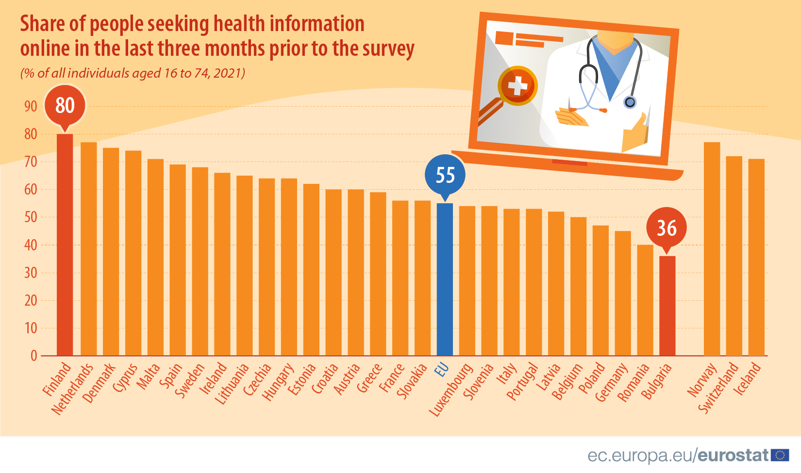 Căutarea de informaţii online legate de sănătate este foarte populară în ţările nordice, în frunte cu Finlanda, unde 80% dintre cei cu vârsta între 16 şi 74 de ani au declarat că au căutat online astfel de informaţii în 2021, urmată de Olanda (77%), Danemarca (75%) şi Cipru (74%).