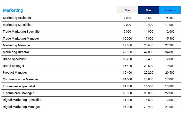 Salariile brute pentru pentru normă întreagă oferite în Marketing, conform ghidului salarial Hays: