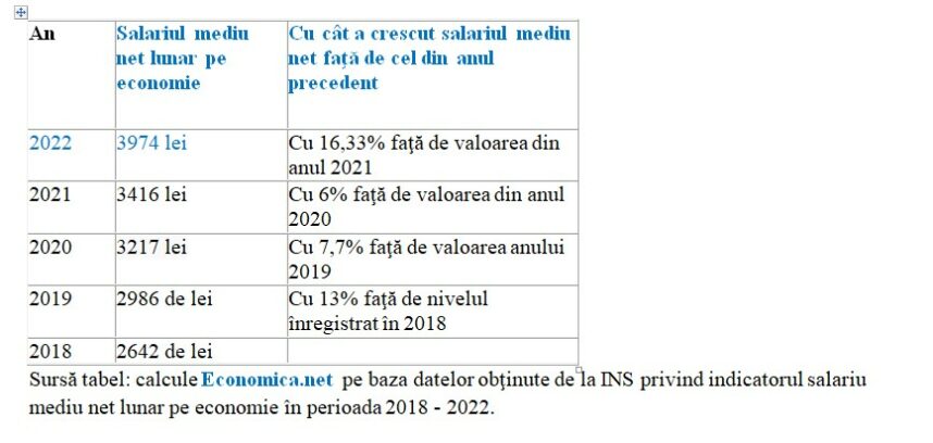 Salariul mediu net lunar pe economie se apropie de 4.000 de lei în anul 2022, arată datele INS, prelucrate de Economica.net. Creşterile valorilor acestui indicator de la un an la altul sunt mai mari decât cele înregistrate de salariul mediu net din Administraţie publică, apărare, asigurări sociale din sistemul public în perioada analizată (2018 – 2022).