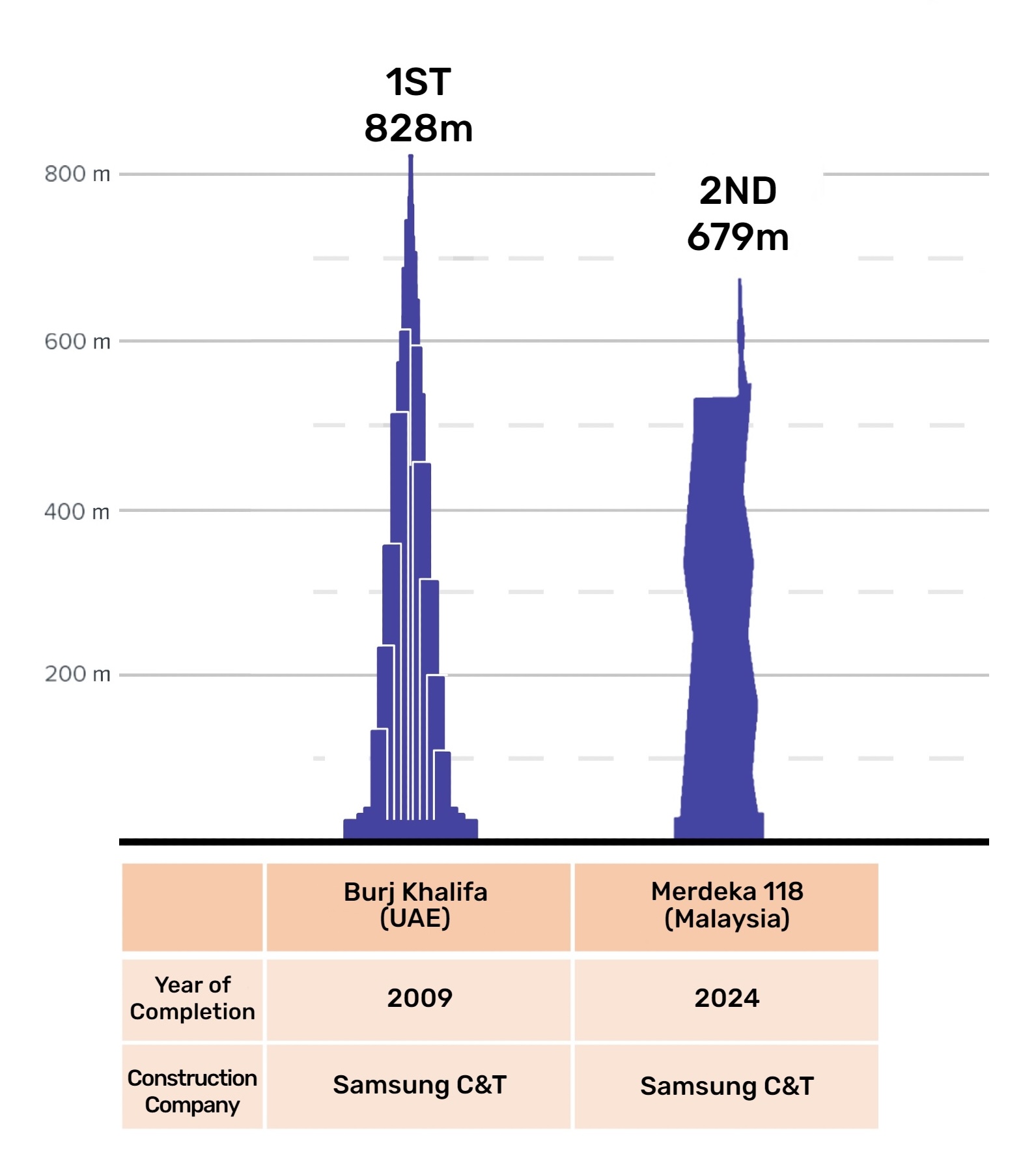 Samsung C&T a construit de curând al doilea cel mai înalt zgârie-nori din lume, clădirea Merdeka 118 (679 metri), care a fost inaugurat în luna ianuarie în Kuala Lumpur, Malaezia. Cel mai înalt zgârie-nori este Burj Khalifa în Dubai (828 metri), care a fost, de asemenea, construită de companie, în 2009.