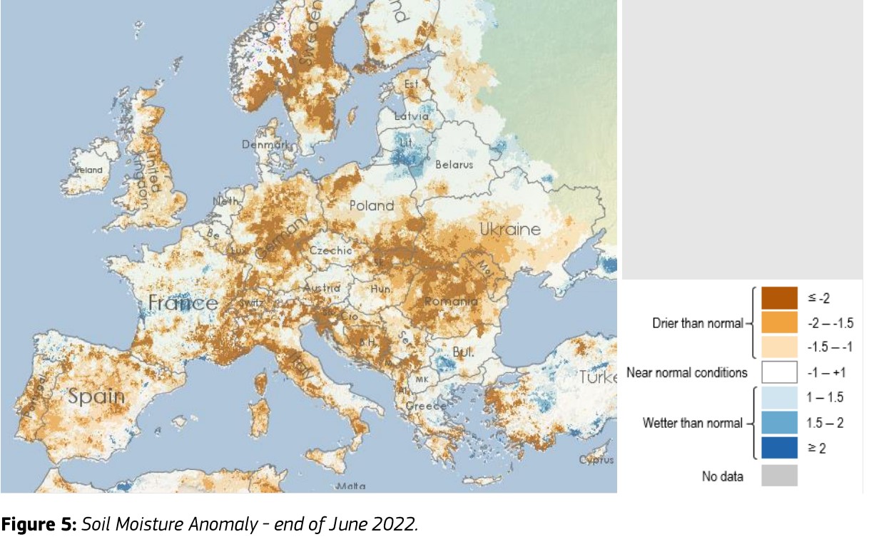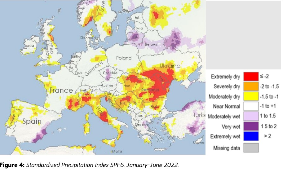 „O parte important[ a Europei este sub avertizare sau alertă din cauza secetei asociată cu lipsa apei din sol sau cu un nivel ridicat de stres hidric și termic al plantelor. Față de lunile anterioare, riscul de secetă a crescut în special în Franța, România și regiunile învecinate, vestul Germaniei și câteva state mediteraneene. Regiunile afectate în primăvară, precum nordul Italiei, sud-vestul Franței și anumite regiuni din Ungaria și România au cindiții similare sau înrîutățite”, se arată în studiul JRC.