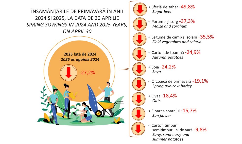 Deși se anunță un an agricol bun, din punct de vedere al randamentelor la hectar, datele statistice indică că nu va mai fi atât de mult teren de recoltat. Fermierii și-au redus cu peste 27% suprafețele semănate cu legume, cereale, sfeclă și oleaginoase față de perioada similară a anului trecut. Mai exact, din datele INS, până la data de 30 aprilie, s-au însămânțat 2,4 milioane de hectare față de peste 3,3 milioane de hectare cu legume, ovăz, orzoaică, cartodi, sfeclă de zahăr, floarea-soarelui, soia, porumb și sorg.