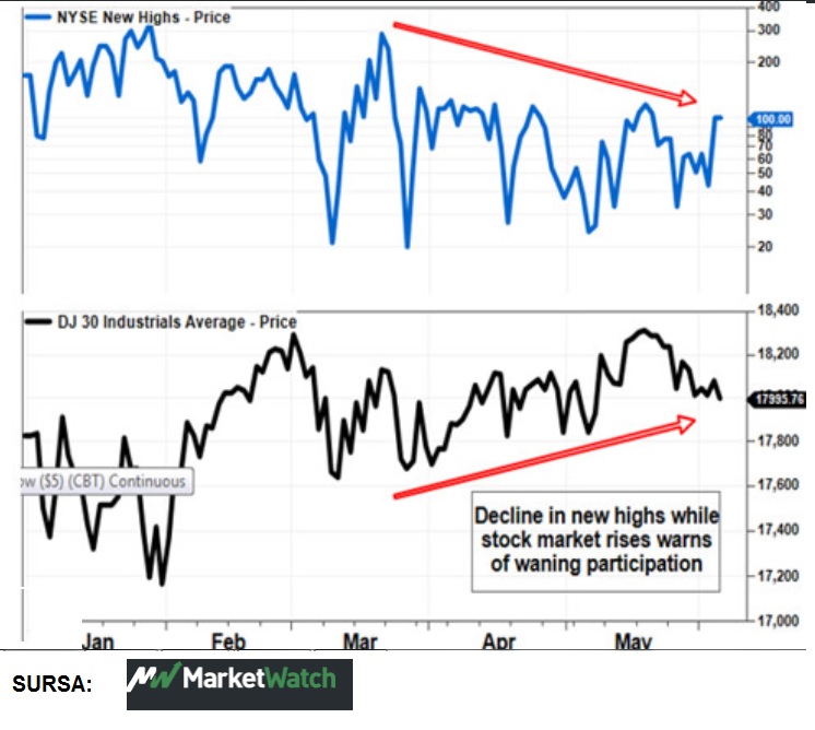 În cazul maximului recent al DJIA din 19 mai, numărul maximelor individuale a scăzut la 118, iar cel al minimelor a crescut.