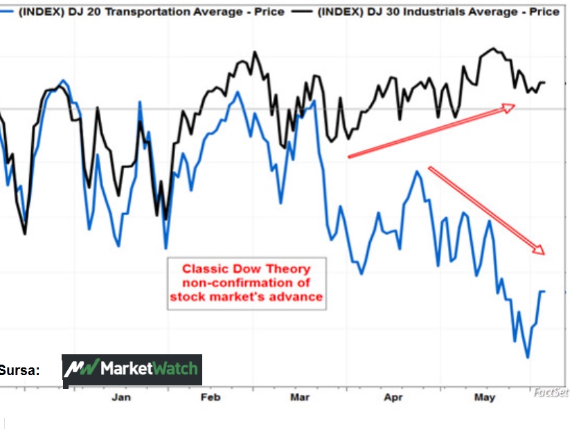 Unul dintre indicatori, arată că, de pildă, celebrul indice bursier Dow Jones 30 Industrial Average a crescut în vreme ce DowJones Transportation Average a scăzut, ceea ce este nefiresc.