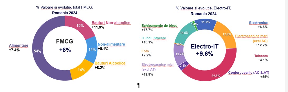 Valoric, plusul a fost de 8,3%, până la un total de 127.3 miliarde de lei în 2024, pentru ambele industrii, cu un avans de 8% la produsele de larg consum și de 9,6% pe segmentul electro-IT. Pe lângă inflație și puterea de cumpărare, în 2024 vânzările au fost influențate și de alți factori, cum ar fi schimbările climatice și de legislație, obiceiuri de consum sau activitatea și dezvoltarea formatelor de retail.