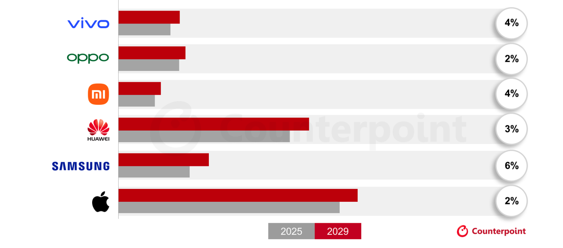 Alți producători Android – Xiaomi, OPPO și vivo – încearcă și ei să urce pe segmentul premium, însă cererea scăzută din China și rezultatele modeste din India au temperat creșterea ASP.