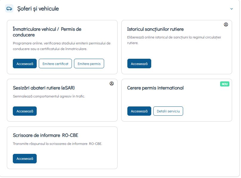 Ca să puteţi interoga secţiunea antemenţionată, intraţi în platforma digitală HUB MAI, accesaţi „şoferi şi vehicule” şi ulterior vi se vor afişa următoarele subsecţiuni: