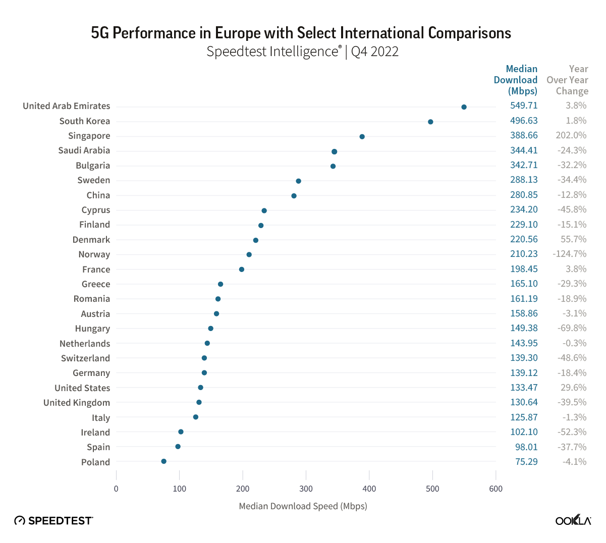 Majoritatea țărilor europene au atins viteze medii de descărcare 5G sub 200 Mbps, ceea ce le încadrează în categoria 5G Improvers. Bulgaria a fost singura țară care a intrat în categoria 5G Leaders, care include țări precum Emiratele Arabe Unite, Coreea de Sud, Singapore și Qatar, cu o viteză mediană de descărcare 5G de 342,71 Mbps, în ușoară scădere față de anul trecut (374,90 Mbps în T4 2021). Cinci țări au intrat în grupul High Performers, obținând o viteză mediană de descărcare 5G de peste 200 Mbps: Suedia, Cipru, Finlanda, Danemarca și Norvegia. ”În mod interesant, cele cinci mari economii europene (Marea Britanie, Germania, Franța, Spania și Italia) au fost depășite de țările nordice și de două piețe din sud-estul Europei (Bulgaria și Cipru). Țările nordice au jucat întotdeauna un rol de lider în telecomunicațiile europene, dar diferența de performanță 5G dintre acestea și cele cinci mari economii indică provocări pe aceste piețe”, notează Ookla.