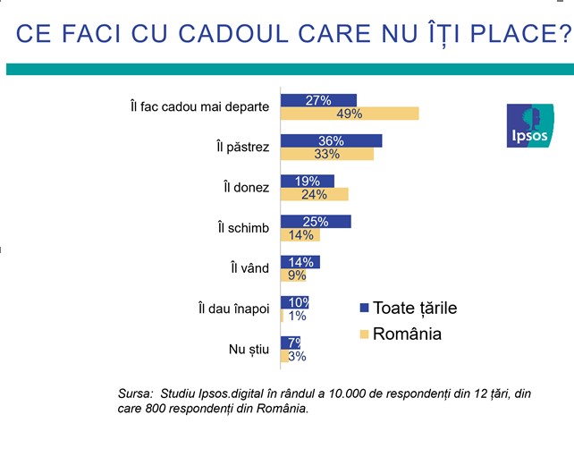 Românii se evidențiază însă prin faptul că dau mai departe, 49% dintre cei intervievați spunând că fac acest lucru. La fel procedează și locuitorii din Singapore (45%), Marea Britanie (32%), Australia (31%). Cei din Singapore ( 35%) și Marea Britanie ( 28%) donează cadourile pe care nu le folosesc, în timp ce în Franța și Germania consumatorii sunt mai predispuși să le vândă (25% respectiv 22%).