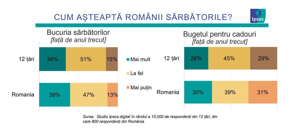 În rândul celor 12 țări analizate, 34% dintre respondenți spun că abia așteaptă să se bucure de sărbătorile de iarnă, comparativ cu 39% dintre români, chiar dacă o treime dintre aceștia (30% față de 26% global) spun că bugetul alocat cumpărării de cadouri va crește, nu pentru că vor fi mai generoși, ci din cauza inflației.