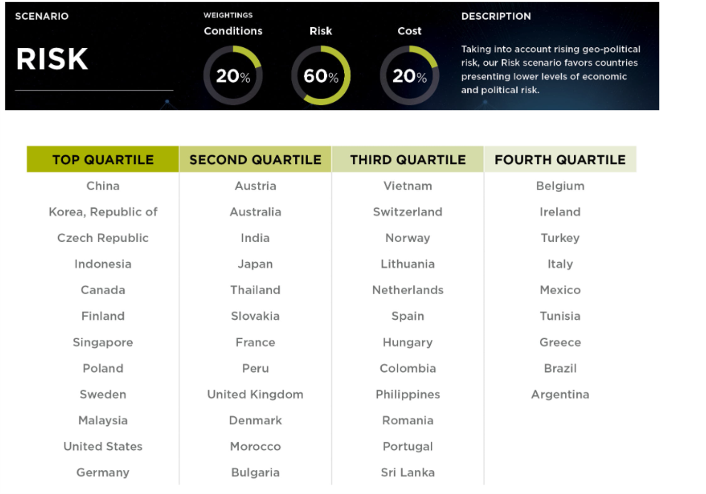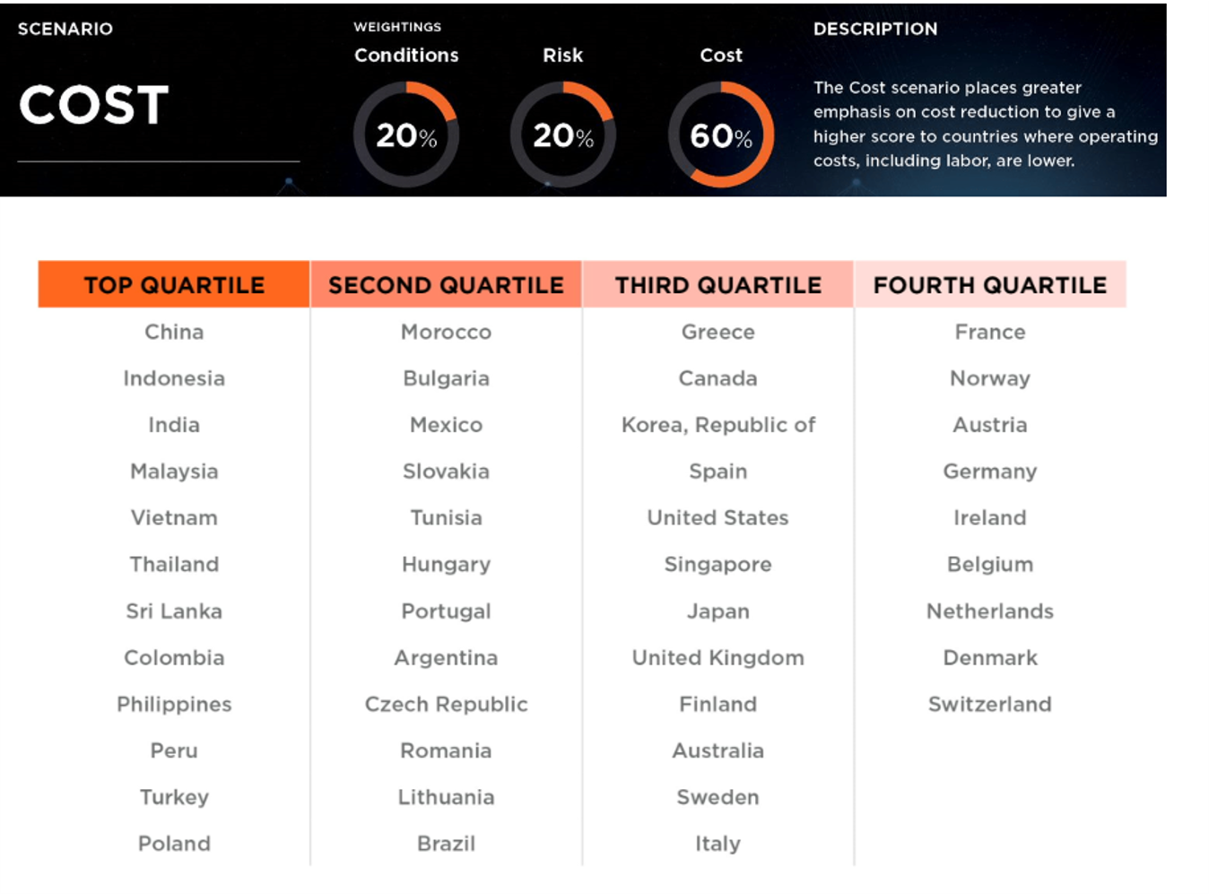 În ceea ce privește condițiile de piață au fost analizați factori precum mediul de afaceri, inclusiv disponibilitatea forței de muncă/a talentelor, accesul la piață, iar pentru costuri au fost luate în considerare cele cu forța de muncă, electricitate și de real estate. Pentru evaluare riscurilor, autorii studiului s-au uitat la situația politică, economică și a mediului de business.
