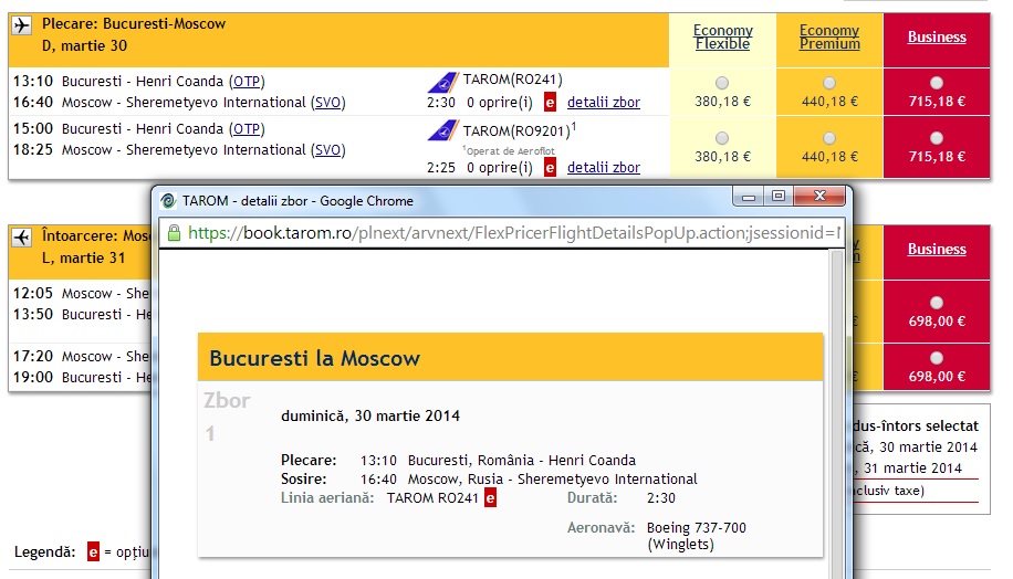 Deşi Tarom nu a anunţat încă oficial această cursă, în sistemul de rezervări online al companiei se pot achiziţiona bilete pe ruta Bucureşti – Moscova începând cu data de 30 martie 2014.