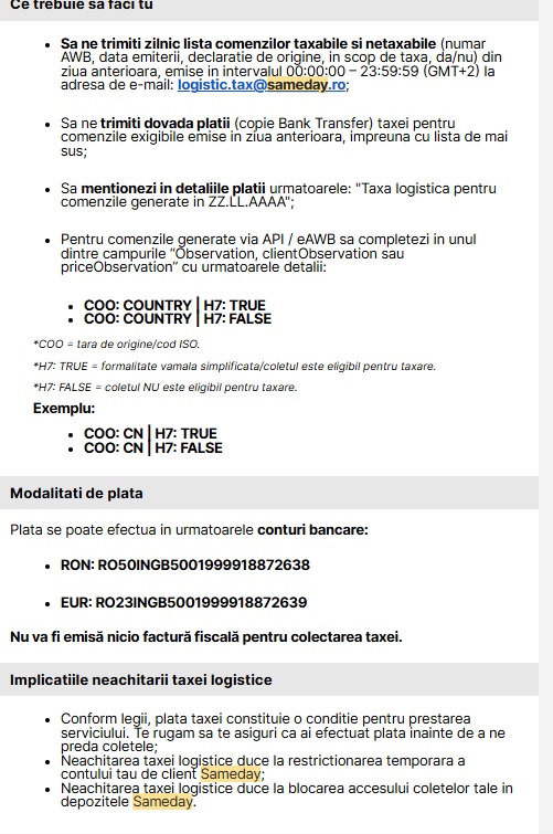 Sameday are și recomandări pentru clienți. Aceștia trebuie să trimită zilnic lista comenzilor taxabile și netaxabile, dar să trimită și dovada plății taxei.
