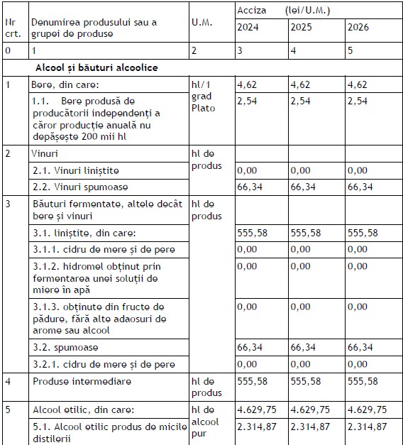 Totodată, printr-o excepție, se propune ca, în perioada 1 ianuarie – 31 decembrie 2024, inclusiv, pentru bere, vin, băuturi fermentate altele decât bere și vin, produse intermediare, alcool etilic să nu se actualizeze nivelul accizei cu creșterea prețurilor de consum din ultimele 12 luni, calculată în luna septembrie a anului 2022, față de perioada octombrie 2014- septembrie 2015, respectiv, calculată în luna septembrie a anului 2023, față de perioada octombrie 2014 – septembrie 2015.