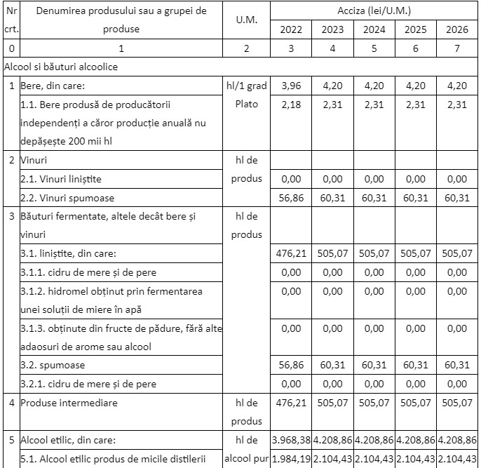 Totodată, schimbări apar și în ceea ce privește stabilirea nivelului accizei în sensul că se propune majorarea nivelului accizelor pentru alcool și băuturi alcoolice, începând cu 1 ianuarie 2024. Spre exemlu, la bere, acciza va crește de la 4,2 lei pe hl grad Plato la 4,62 lei pe hl grad Plato.