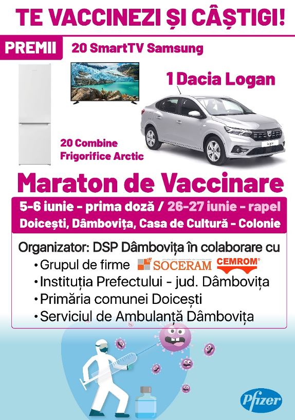 In urma administrarii vaccinului, persoanele se vor putea inscrie la tombola ce va cuprinde urmatoarele premii:
