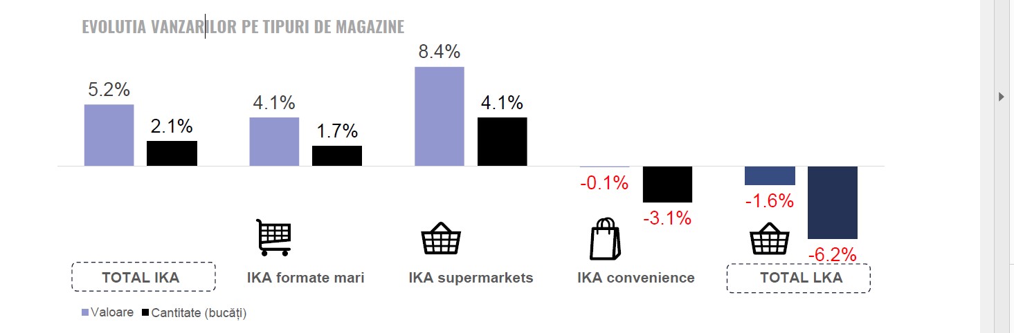 „Începutul anului 2025 a înregistrat un progres foarte lent al vânzărilor generale, cu scăderi ale cantităților vândute pentru IKA ( International Key Accounts) convenience si LKA ( Local Key Accounts). Supermarketurile continuă să conducă în clasamentul evoluțiilor IKA, atât in valoare, cât și în cantitate, fiind cel mai de succes format de proximitate. Prin contrast, in 2024, toate formatele aveau o evoluție pozitivă, supermarketurile și convenience conducând creșterea în cantitate (6.6%, și 4.8% vs 2024)”, comentează analiștii Retail Zoom.