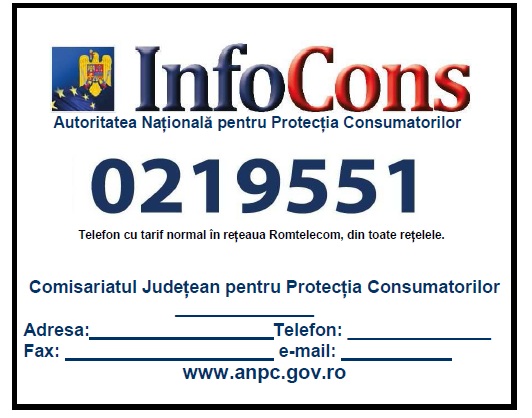 De la începutul anului, printr-un ordin al preşedintelui Asociaţiei Naţionale pentru Protecţia Consumatorului, Bogdan Nica, telefonul consumatorului cu apel gratuit 0800 080 999 a fost schimbat cu „TELEFONUL CONSUMATORULUI – INFOCONS – 021.9551, linie telefonică cu tarif normal. Comercianţii sunt obligaţi să afişeze numărul de mai sus în geamul unităţii, pe o plachetă standardizată care poartă marca INFOCONS.