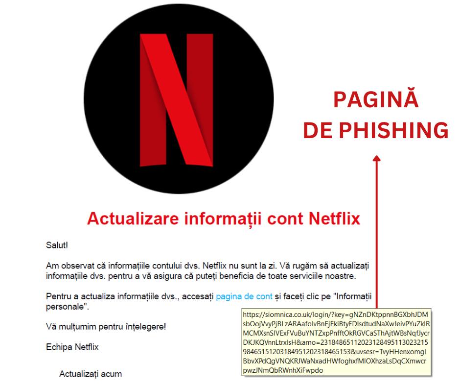 ”Ai primit un e-mail, sau poate chiar un SMS de la Netflix, prin care ești notificat că trebuie să-ți ‘actualizezi informațiile de client’? Ai grijă! În spatele inițiativei sunt infractori cibernetici care vor să-ți fure datele de autentificare. Textul în limba română este unul corect din punct de vedere gramatical, ceea ce, în lipsa unor verificări elementare, ar face ca un astfel de atac să aibă o rată de succes crescută”, arată DNSC.