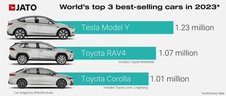 Chiar dacă mai există câteva piețe care nu și-au publicat încă cifrele de vânzări pentru 2023, datele preliminare colectate de JATO Dynamics indică faptul că Tesla Model Y se află pe o poziție de neclintit, cu 1,23 milioane de unități vândute între ianuarie și decembrie 2023 – marcând o creștere de 64% de la an la an.